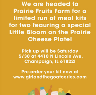 Girl & the Goat-ceries (of Girl & the Goat and Chef Stephanie Izard) is headed to Prairie Fruits Farm for one time only! We heard you and we’re bringing a limited amount of our Goat Restaurant favorite dishes via these meal kits (cooking required) for pick up on Saturday 5/30 from 3:30-6pm! Menu includes delicious proteins to grill out or make on your stovetop, such as pork sausage satay, herb marinated shrimp, fun sides like a Gotham Greens grilled salad, house made pita and cookies from Little Goat Bakery! Best of all- this meal kit features a special Little Bloom on the Prairie cheese plate!